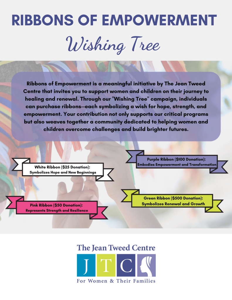 The Ribbons of Empowerment Campaign (Wishing Tree) is a way to show your support for the women and children served by The Jean Tweed Centre. Each ribbon symbolizes strength, hope, and empowerment. When you donate, your ribbon will be placed on our beautiful on-site Wishing Tree—a powerful symbol of renewal and transformation. You’ll also see your ribbon added to our virtual tree, which is updated every few weeks. We’ll send you an email when your virtual ribbon is displayed.